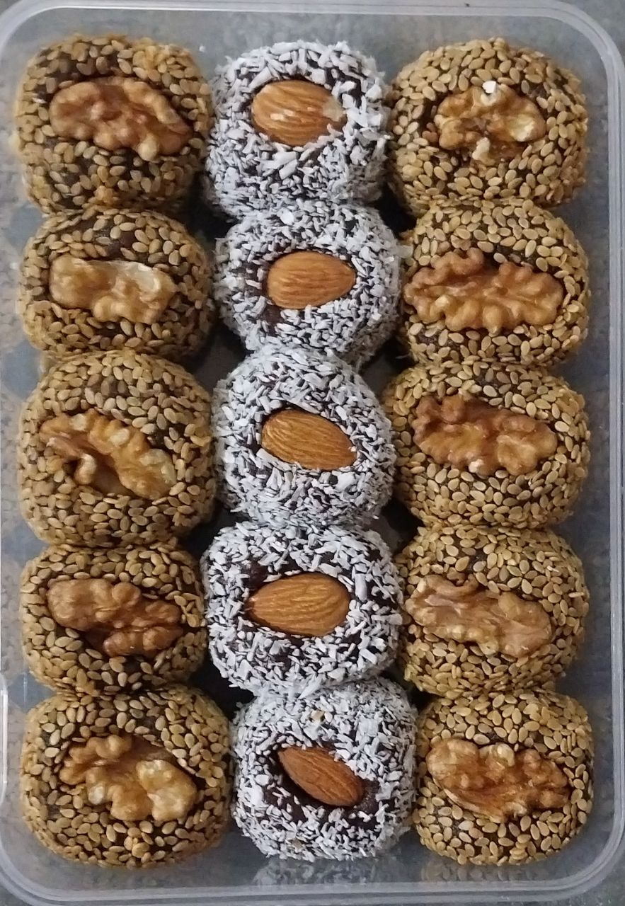 ترافل خرمایی ویژه با روکش کنجد.پودر نارگیل.گردو.بادام در بسته بندی های 15عددی با وزن 500گرم