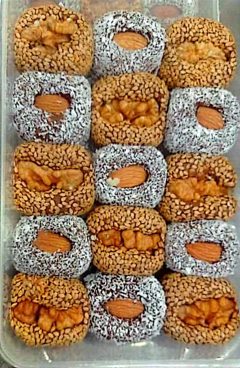 ترافل خرمایی مغزدار گردویی بادامی با کنجد