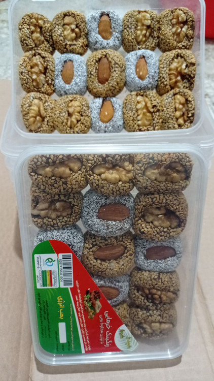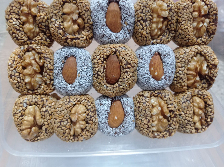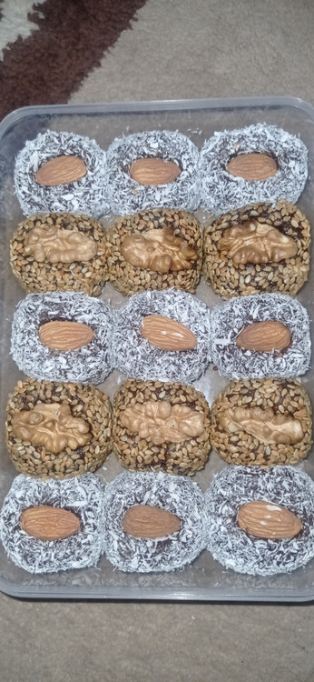 ترافل خرمایی ویژه با روکش کنجد.پودر نارگیل.گردو.بادام در بسته بندی های 15عددی با وزن 500گرم