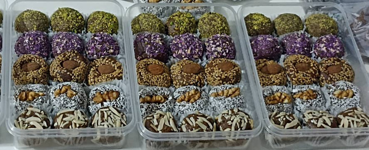 ترافل معجون خرمایی با روکش پسته و گل محمدی.تخمه افتابگردان.پودر نارگیل در بسته بندی 15عددی 500گرمی